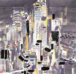吳冠中借喻了魯迅筆下的“小樓”,表述的是自己躲進藝術殿堂,走南闖北,東尋西找,上下求索的境懷;以及越過傳統筆墨、傳統圖式,不為外界左右的藝術激情。“點、線、面,黑、白、灰,加自家色彩”是吳冠中藝術形式的七要素。在這幅畫中,作者將這些要素充分展示給了觀眾。另一幅作品《香港夜景》是吳冠中受香港土地發展公司邀請,專程在香港停留一個月而創作出的嘗試性作品之一。畫面無處不涌動著作者的創作激情,其大膽的跳過線的點與面的結合,加上豐富色彩的綜合運用,將香港之夜表現得熱鬧而又神秘。吳冠中曾多次撰文提到這次香港創作之旅:“我確乎愛那些古老市街的風采,那是我青少年時代所熟悉的祖國鬧市,我曾在其間逛游,當時只是觀光,無錢購物,今日坐在香港街頭寫生,筆底卻流露出童年的憧憬來。”