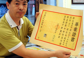 遼寧省沈陽市民間收藏家詹洪閣近日展出了十多年來收藏的各類畢業(yè)證多達(dá)千件,其中最早的可追溯到清末宣統(tǒng)二年(1910年)。這些畢業(yè)證大小不一、形式各異,叫法也不盡相同,卻是中國百年教育史的縮影。 這些畢業(yè)證名稱并不統(tǒng)一。有的名為“卒業(yè)證”,有的名為“休業(yè)證”,有的叫做“修了證”。據(jù)詹洪閣統(tǒng)計,名稱多達(dá)10余種。 年代最為久遠(yuǎn)的是一張清末師范學(xué)堂頒發(fā)的“修業(yè)文憑”,距今整整100年。這張文憑不僅詳細(xì)記載了學(xué)生姓名、籍貫和12門功課的成績,而且學(xué)生祖上三輩“曾祖、祖父、父親”姓名都記錄在冊。 每張畢業(yè)證都有著時代的烙印。民國時期的畢業(yè)證大都印有“青天白日滿地紅”旗幟,偽滿洲國時期東北一些學(xué)校所發(fā)畢業(yè)證還印有龍紋;新中國成立后,畢業(yè)證上印上了紅旗、國旗或是毛澤東像,有的則印著“為人民服務(wù)“救死扶傷,實(shí)行革命的人道主義”等字樣。 由于畢業(yè)證上大都留有校長的親筆簽名,因此這些證書也成為老教育家執(zhí)教經(jīng)歷的見證。北京大學(xué)1954年頒發(fā)給學(xué)生高振斌的畢業(yè)證上,校長留名是著名人口學(xué)家馬寅初;民國期間國立政治大學(xué)頒發(fā)的一張畢業(yè)證,學(xué)者顧毓琇的名字寫在證書上;華北大學(xué)的一張畢業(yè)證上,校長是吳玉章,副校長是成仿吾和范文瀾。 在詹洪閣收藏的畢業(yè)證中,學(xué)歷高可達(dá)大學(xué)、碩士,低可為學(xué)前甚至掃盲。上海市新成區(qū)中心小學(xué)發(fā)給7歲的馮阿鳳的就是一張“保育證書”,上面寫著“在小學(xué)附設(shè)幼兒園保育期滿,特發(fā)此證”。還有一張是1955年發(fā)給一名30歲婦女的“識字證書”,恰是新中國成立后各地掀起掃盲識字活動的真實(shí)記錄。