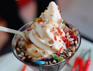 來自美國進口的冷凍花崗巖板可非一般,它是帶給你一款完美冰淇淋的重要環節——拌冰臺。零下9℃的冰凍花崗巖石板觸及冰涼,作用于冰淇淋坯和各種配料的混合成形,拌冰工具為同樣冰冰涼的冰鏟。每個店員都有朝氣蓬勃的團隊氣質,他們還能每隔一會兒唱歌給你聽,隔空拋接冰淇淋球的表演絲毫不亞于雜技演員。每個店員都經過專業培訓,利用雖執拗但已經被他們操作麻利的拌制手法,讓原本在冰凍柜臺中硬硬的冰淇淋回復蘇醒,隨之加入各種你一見鐘情的配料,一杯綿滑香濃的冰淇淋就這樣誕生了。 拌冰的程序是每個店員都成為冰淇淋專家的重要步驟。選擇口味:巧克力、香草、芝士蛋糕、草莓、芒果雪貝等各種美妙滋味,尤其推薦芒果口味。選擇杯型:推薦中杯(170克)。選擇配料:醬料、各種巧克力豆、彩虹糖粒兒、各種餅干、水果、果仁。最后考慮下你是否需要2元一個的華夫底托,這是酷圣石冰淇淋最美妙的視覺和口感中的另一所在。推薦室外座位和樓上座位,三里屯和雅秀間的風景一目了然。顧客中老外居多,27元/小杯,39元/中杯,50元/大杯。 地址:朝陽區工體北路三里屯VILLAGES9-19-20號