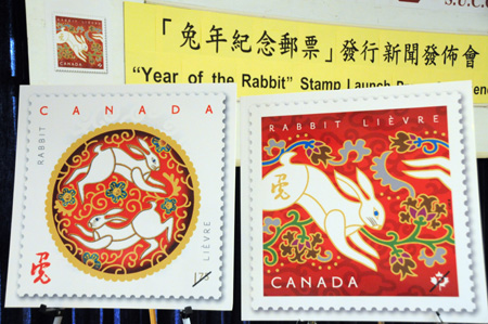 加拿大郵政總局宣布將在2011年1月7日發行兔年生肖郵票,以慶祝中國農歷辛卯兔年,這是加拿大新一輪生肖系列郵票中的第三套,分為國內版和國際版。這款兔年生肖郵票樣本日前在溫哥華亮相,左為國際版,右為國內版。
