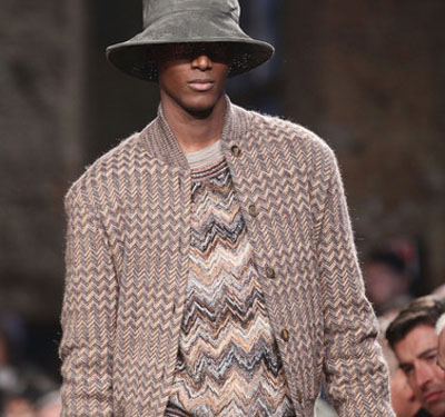 米索尼 (Missoni) 2011秋冬男裝用多變的針織與柔和的漸變色營造出十足的溫暖感,松垮的輪廓、舒適的面料,長長的針織圍巾與遮住眼睛的麂皮軟帽,帶著些閑散不羈的波西米亞情調。