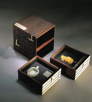 古時文人的文玩盒,原先是用來放置筆、墨、紙、硯等文房用品的。但是隨著文玩種類的逐漸增多,其中也開始收納例如鎮(zhèn)紙、印章等,由于數(shù)量越來越多,且其中物品的實用性逐漸減弱,而觀賞性逐漸增強,因此其也被稱為是文人的“玩具箱”。在2009年北京保利的秋拍中,一套書卷式百寶盒及文房珍玩(十六件)以17.92萬元成交。