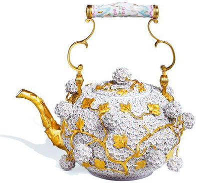 圖中這款“雪花球”茶壺是梅森為了慶祝成立300周年而復制的特別款,應用了陶瓷藝術大師Johann