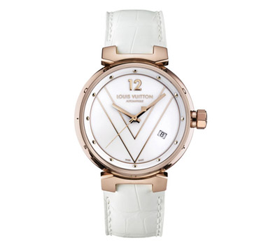 表盤V形標志的設(shè)計靈感來自路易威登經(jīng)典皮具——Steamer手袋。獨特而醒目的標志襯托出這款腕表細致、含蓄的特質(zhì)。玫瑰金和白色烤漆的完美結(jié)合將Tambour