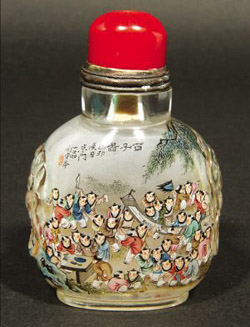 內畫鼻煙壺是十九世紀初期產(chǎn)生的鼻煙壺品種,它是用一支帶鉤的細竹筆伸到透明的鼻煙壺內壁作畫。人物、山水、花鳥、草叢、肖像畫法應有盡有,早期的代表人物為甘烜,到清末民初著名的藝人有周樂元、馬少宣、丁二仲、葉仲三等。他們的作品流傳于世,為世界各國收藏家競相收藏。中國內畫鼻煙壺自甘烜創(chuàng)始以降,至今約二百年,因此這個行業(yè)也被國家列為重點扶植的非物質文化遺產(chǎn)。