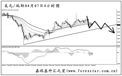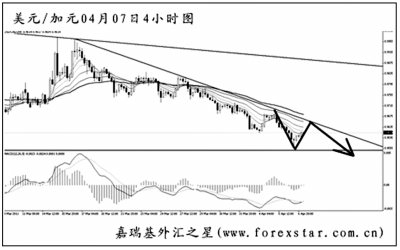 ▲美元兌加元的下跌勢頭保持良好,再度創(chuàng)出新低之后,將周線圖0.9710的支撐也順利跌破,后市將挑戰(zhàn)的點(diǎn)位是2007年11月初的低點(diǎn)0.9060。圖中下降趨勢線和均線系統(tǒng)的雙重壓制對匯價(jià)的反彈造成了很大的影響。預(yù)計(jì)匯價(jià)回探趨勢線后將繼續(xù)以下行為主。