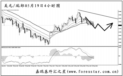 ▲美元兌瑞郎的反彈最終受阻于日線圖的下降趨勢線及均線系統,匯價短線下行調整,在對前期的漲幅進行修正。4小時圖MACD顯示下跌動能充足,關注0.8705一線的支撐力度,此位置為道氏低點,同時也是此前上漲的61.8%幅度回調,預計匯價跌到此位置后有望重新轉為上行。