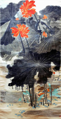 作于1947年的設色紙本立軸《嘉耦圖》長約1.84米、寬約0.9米,以荷花入畫,寓意佳偶天成。畫中精工細致的描金朱荷,在墨綠漬染的田田茂葉的襯托下,富麗堂皇而不沾匠俗之氣,濃蔭中的雙棲鴛鴦色彩斑斕、悠然自得。全畫氣度宏大、層次井然,是張大千潑彩潑墨畫法的代表作。