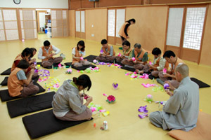 用餐后,大家進行簡單勞動(洗碗、清掃等),步行親近自然、學習做蓮燈等活動。專心從事著簡單的肢體勞動,腦中的雜念仿佛都消失了。