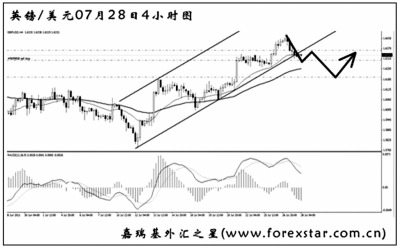 澳元兌美元經過了2個半月的調整,終于再度上沖創出新高,日線圖的次要節奏調整宣告成立。由于澳元上方也沒有任何有效的阻力,現在的操作思路以做多為主。圖中的上升趨勢線為最近的支撐,警惕匯價向此趨勢線調整,但直接跌破的希望不大。