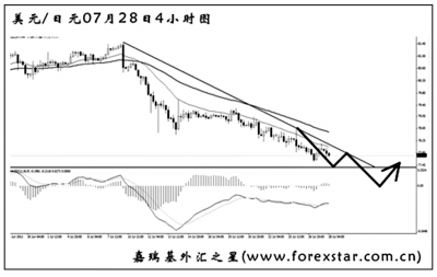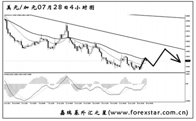 美元兌瑞郎在經過一段震蕩走勢之后繼續創新低,瑞郎的漲勢無法阻擋。由于瑞郎最近持續處于極端強勢的走勢中,且下方沒有任何有效支撐,短線匯價即使展開一小波調整,但升破圖中下降趨勢線及均線系統的希望也不大,后市美元兌瑞郎將以沖高后繼續走低的趨勢為主。