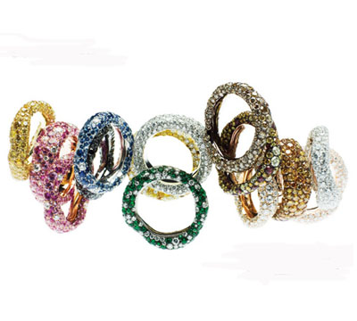 甜甜圈系列,有著非常可愛的名稱,也有讓人看了會心一笑的愉悅樣貌。這些迷你鉆石甜甜圈戒指,每一個都有不同的型態(tài)與曲線,第一款是全面鑲滿白鉆的糖霜甜甜圈,也有鑲嵌彩色鉆石、藍(lán)寶石、玫瑰榴石的各種「風(fēng)情」問世。看似簡單的單環(huán)戒指,在設(shè)計師親手蠟雕下形塑出立體弧度與層次感,所一貫堅持的360度全面鑲嵌鑲鉆法,讓每個戒指可以有多重配戴方式,并擁有多變的搭配性。