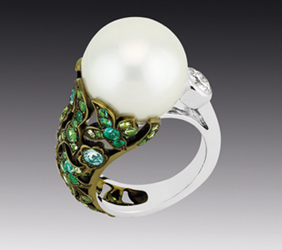 這些珠寶以非傳統的方式混合了不同的材質和構造,從而開啟了嶄新的篇章。就如同俄耳甫斯神奇的七弦琴,這些珠寶擁有催眠的魔力。也許,俄耳甫斯甜美的樂曲使得這些珍貴的鉆石和光亮的石頭瞞過賽壬和地下守護神的眼睛從而被藏匿起來。一個盤繞的以鉆石包裹的鑄造圓環被整齊纖細勻稱的黑色柱條套住,并以完美的白珍珠串固定。放射狀的月光石、鉆石和蛋白石組合暗示北方奶白色的天空,水晶組成的釘狀花瓣插入其間,結合形成仿古的花朵。最讓人喜歡的是一條以月光石珠子、珍珠、藍灰色尖晶石和鉆石渦旋串連起來的項鏈,它就像倒映在深夜冰冷海面上的漫天星斗一樣美麗。看著這些夢幻般的珠寶,靜靜的冥想,如同掉入它們的魔咒一般。