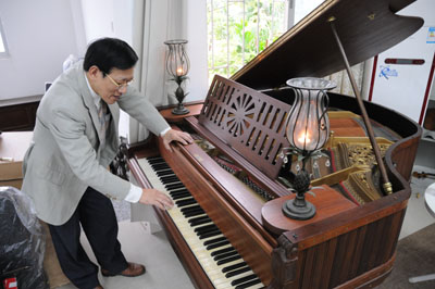 年逾六旬的館主陳恭是福建職業(yè)藝術(shù)學(xué)院的退休教師,年輕時畢業(yè)于上海音樂學(xué)院樂器制造專業(yè),他會制造樂器,尤其擅長修復(fù)古董樂器。陳恭說:“我從事樂器研究、制作、維修已幾十年,積累了大量樂器制造、歷史和文化方面的知識,我收藏這些樂器,就是為了要讓更多的人感受到樂器文化的美好。”圖為陳恭收藏的具有130多年歷史、純手工制造的德國漢諾威鋼琴。