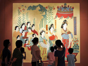 今夏“博蘊華光敦煌藝術展”在深圳開展,展覽展出內容主要包括原大敦煌石窟復制洞窟、壁畫臨本、藏經洞絹畫復制品、彩塑復制品、精品文獻等。新華社發(賀友保/攝) |