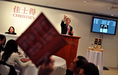 圖為香港佳士得舉行的亨瑞·賈耶私人窖藏勃艮第佳釀拍賣會現場。
