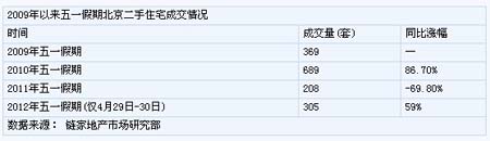 根據北京住建委網站的網簽數據統計,2012年“五一”假期頭兩天(4月29日-30日)北京全市二手住宅網簽總量為305套,與2011年“五一”假期頭兩天的網簽量相比上漲了54%;與今年清明假期頭兩天的網簽量相比上漲了535%。