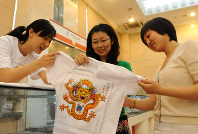 近日,隨著壬辰龍年郵票熱銷,中國集郵總公司推出一款以壬辰龍年郵票為圖案的文化衫,受到消費者的喜愛。圖為在中國集郵專賣店北京和平門店,工作人員(左)在向顧客介紹龍年郵票文化衫。新華社發