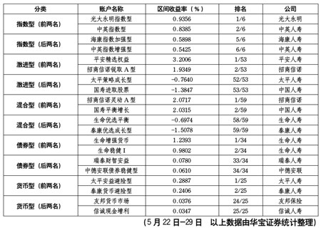 根據華寶證券統計,5月22日-5月29日,投連險各賬戶普遍跟隨大盤取得正收益,各投連險賬戶平均區間收益為0.47%。然而,仍有5%的賬戶區間實現負收益,其中泰康人壽旗下的泰康優選成長型賬戶以-1.5078%的區間收益率在所有納入統計的177個投連險賬戶中墊底。