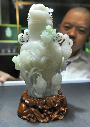 第八屆湖南珠寶玉石收藏工藝品展日前在位于長沙市的湖南省展覽館開展。據(jù)了解,本次展會展出面積達(dá)20000平方米,有來自國內(nèi)外的600多家企業(yè)參加,共展出珠寶、收藏展品10萬余件。圖為湖南珠寶玉石展上展出的一件玉石雕刻件。
