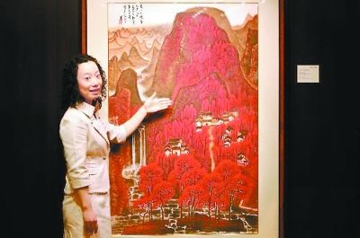 拍賣行工作人員在介紹李可染巨作《萬山紅遍》。