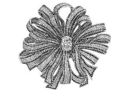 Couture系列中鉆石胸針以18K白金做主基調,鑲嵌一顆橢圓形切割重2.5克拉主鉆,周圍配以1404顆總重6克拉白鉆及1553顆總重7克拉黑鉆。