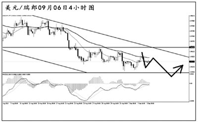 美元兌瑞郎沿下降通道一路下行,4小時圖發(fā)生了明顯的MACD底背離信號。目前上方的明顯阻力在道氏高點加通道上沿的雙重壓制位0.9630一線,升破方可展開明顯的反彈節(jié)奏。日線圖上看,美元兌瑞郎距離下方強支撐0.9425還有一段空間,匯價仍將保持震蕩下跌的節(jié)奏。