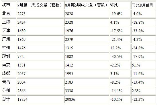被業內寄予厚望的傳統樓市銷售旺季“金九銀十”上周在平淡中拉開序幕。根據鏈家地產市場研究部統計,包括北上廣深四個一線城市在內的十個重點城市上周(9月3日至9日)總成交量為18734套,環比8月最后一周減少了10.1%,較8月第一周下降了12.3%。大部分城市基本都出現了不同程度的下滑。“去年價格是真降,而今年則更多是開發商的"作秀"。”有業內人士告訴記者,房價一定程度的回升及8月下旬市場供應不足是9月初樓市成交開局不利的主要原因。