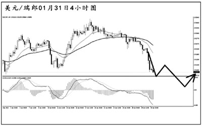 美元兌瑞郎在經過了一周多的震蕩下行之后,短線空頭突然發(fā)力,本周中日線圖連續(xù)兩天收出實體大陰線,顯示出強勁的下跌勢頭。目前匯價已經接近了前方低點0.9075的支撐,若突破,中線跌勢將進一步確立。由于短線下行斜率陡峭,匯價面臨一定的上調壓力,但整體看跌的思路不變。
