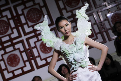 2013年歡樂春節·中國風格時尚發布會日前在位于塞納河畔的巴黎中國文化中心舉行。北京服裝學院服裝系教師楚艷和旅法中國設計師許茗在發布會上展示了自己的作品。圖為模特在展示許茗作品。