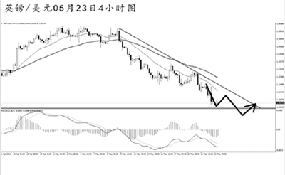 歐元兌美元調整之后再度強力下行,下方的強支撐在前方低點1.2745。4小時圖上看,歐元正處于第五浪下跌之中,均線系統回歸空頭排列的狀態。短線雖然有下跌動能明顯減弱的信號,但預計歐元將保持弱勢,若順利跌破1.2745,歐元將繼續向1.2650一線發起沖擊。