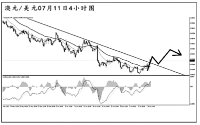 澳元兌美元下跌勢頭連續減緩,短線匯價小幅反彈,逐步向4小時圖下降趨勢線一帶發起調整,目前小幅升破此線。小時圖均線系統已經轉為向上的排列,多頭力度強勁。預計澳元小幅回抽趨勢線之后將繼續保持上行的節奏,若順利升破0.9345,澳元將打開進一步的上行空間。