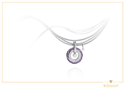 魔幻紫晶護(hù)身符吊墜 Wellendorff全新魔幻紫晶系列護(hù)身符吊墜迷人而嫵媚,不僅因?yàn)樗錆M魅惑的色彩,同時(shí)也因?yàn)樗?種不同佩戴方式。魔幻紫晶護(hù)身符吊墜的外環(huán)由神秘的紫色與至純的18k白金相互輝映,構(gòu)成Wellendorff經(jīng)典風(fēng)格的抽象羽翼,同時(shí),也為中心的單顆鉆石和整環(huán)鑲鉆的內(nèi)環(huán)增加了現(xiàn)代時(shí)尚的氣息。中心的獨(dú)立鉆石與整環(huán)鑲鉆的內(nèi)環(huán)都懸掛于一個(gè)精致的珠寶彈簧卡夾之上。謹(jǐn)小慎微又精細(xì)別致的Wellendorff金匠藝術(shù)可以在其精確加工的閉合機(jī)制中得以窺見:即便是在打開的時(shí)候,依舊可以安全可靠地保證圈環(huán)的位置而不會(huì)掉落。