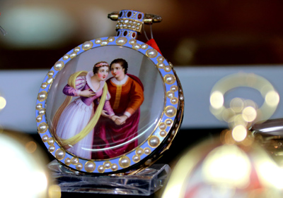 這是在日內(nèi)瓦佳士得秋季拍賣香港預(yù)展上展出的一塊1820年制作的18K金琺瑯鑲珍珠懷表,估價為9.5-15萬美元。