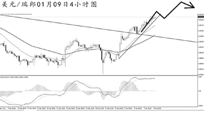 美元兌瑞郎的上沖勢頭迅猛,最近一周多的時間有3天收出實體大陽線。日線圖的下降壓力線已被升破,上方強阻力在0.9250。短線上漲斜率陡峭,匯價繼續(xù)走高的概率很大。小時圖MACD持續(xù)發(fā)生了角度明顯的頂背離信號,但在趨勢線跌破之前,不宜激進看空。預計匯價小幅調(diào)整之后將延續(xù)上漲勢頭。
