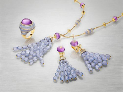 Bvlgari推出的Spindle系列珠寶秉承了品牌的傲人傳統(tǒng),探索著新穎、鮮活而大膽的色彩組合——藍玉髓與紫水晶、黃水晶搭配,在密鑲鉆石所散發(fā)的點點璀璨光輝的映襯下,愈加呈現(xiàn)出溫潤柔和的獨特美感。