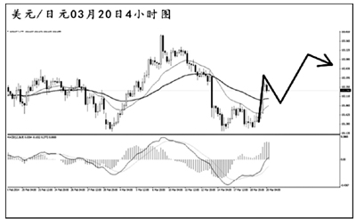 美元兌瑞郎短線發起強勁反彈。4小時圖MACD多頭動能充盈,目前需重點關注下降趨勢線的阻力位0.8850一線,若能升破此位置,匯價還將展開更為強勁的上攻。
