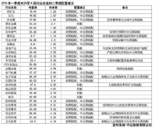 2014年二季度前期,建議適當超配金融、有政策支持預期的區域性房地產和上游行業,低配中游制造行業和下游消費行業;二季度中后期,建議低配金融房地產和上游行業,超配中游制造行業和下游消費行業。對個別行業也有例外建議。