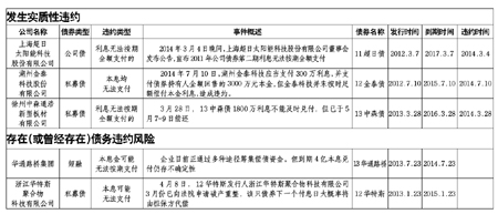 2014年3月4日晚間,上海超日太陽能科技股份有限公司董事會(huì)發(fā)布公告,宣布2011年公司債券第二期利息無法按期全額支付,從而構(gòu)成國內(nèi)首例債券違約事件,并拉開了2014年債務(wù)違約的序曲。截至7月,市場上發(fā)生實(shí)質(zhì)性違約及有違約風(fēng)險(xiǎn)提示的債券下表。