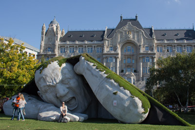 為期4天的當代藝術展“布達佩斯藝術市場”12日閉幕,其組織者在閉幕之際將匈牙利人海爾維·羅蘭特·艾爾文創作的這件雕塑作品布置在市中心,代表“布達佩斯藝術市場”向今年告別。