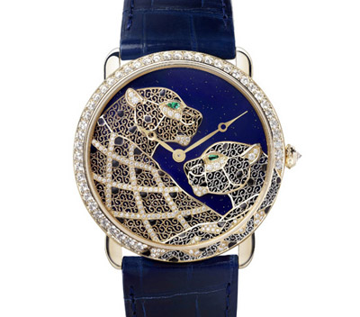 Filigrane金銀絲細工美洲豹裝飾腕表,通過其形象生動而精致細膩的設計,重新詮釋了古老的金銀絲細工技藝。這一具有鮮明革新性的創作探索,見證卡地亞重拾并傳承失傳工藝與技術的神圣使命,正如2013年的金屬珠粒工藝。