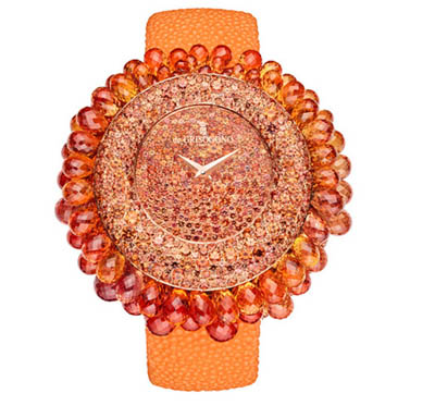 的非凡破格創(chuàng)意與頂尖工藝早已備受推崇,作品每每有打破常規(guī)、令人嘆為觀止的奇思妙想,純熟結(jié)合品牌高級(jí)珠寶制作與制表工藝專(zhuān)才,輔以華貴絕色寶石、一流切割技術(shù)與頂尖鑲嵌造詣,令珠寶時(shí)計(jì)平添與眾不同的個(gè)性風(fēng)韻。Grappoli系列薈萃五款獨(dú)一無(wú)二新作,除了綠寶石與白鉆之外,還有彩鮮目眩的橙藍(lán)寶、濃艷華貴藍(lán)寶還有溫潤(rùn)紫晶,如繽紛彩虹眾色競(jìng)爭(zhēng)妍。