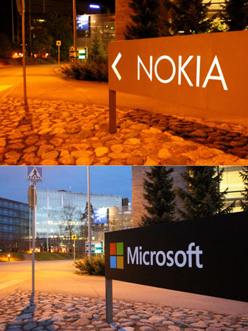 諾基亞2014年4月25日宣布完成向微軟出售手機(jī)業(yè)務(wù)部門。拍攝于2013年9月8日,位于芬蘭埃斯波的諾基亞總部;下圖拍攝于2014年4月26日,位于芬蘭埃斯波市的原諾基亞總部已更換微軟標(biāo)志。記者 李驥志/攝 |