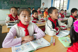 2007年,上海市教委將改善農(nóng)民工子女學(xué)校辦學(xué)條件列入年度重點工作。11月13日,上海浦東新區(qū)大別山小學(xué)農(nóng)民工的孩子們在英語課上朗讀單詞。新華社記者:鄭悅
