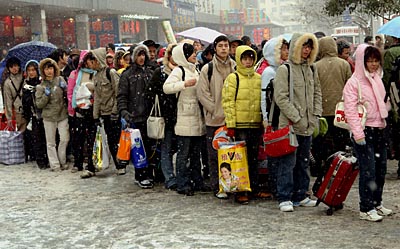 一年的牽掛,系于一張車票。 1月13日晚上,上海迎來了2008年的第一場雪。不少準備春節回家的人,為了能買到一張“回鄉票”,不得不通宵排隊。 在上海南站售票處,來自貴州銅仁的一位19歲打工妹說:“已經通宵排了兩天了,昨天早上8點被告知沒票,就回宿舍睡了一覺,傍晚再過來排隊時,發現前面又有近20人了。聽說原來排在前面的400多人都發到了排隊預約票,真后悔回去睡了一覺!” 在排隊的長龍里,有一個乍看很是臃腫的人格外引人注意,上前一看,原來是一對農民工夫婦為了取暖而緊緊相擁,用兩人的衣服包裹在一起驅寒。 15日下午,上海火車站聯合售票大廳一樓。“晚上我們就準備睡在售票大廳!币讶隂]回家的王師傅說,他幾天前從杭州趕來上海,為自己和工友購買由上海至四川廣元、成都的火車票,已經在售票大廳度過了三個晚上。 王師傅說,來了三天還是沒能買到票,得怪自己“失誤”:原以為排隊買次日的車票肯定沒有問題,不料晚上來到售票大廳,發現前面已排有十多個人,輪到自己時,票已售完。吸取教訓后,王師傅白天不敢隨便走動,午飯和晚飯就讓別人幫忙帶點盒飯,到第二天早上,終于買到了五張站票。 連日來,火車站售票處人頭攢動,絕大多數都是準備買票回鄉的農民工。對于睡在地上的許多人來說,他們心中的天堂就是夢鄉,就是家鄉。
