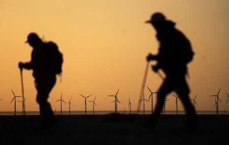 5月19日清晨,甘肅酒泉市瓜州縣的戈壁灘上,兩名戶外運動愛好者徒步走過的朝陽映照下的風力發電機。