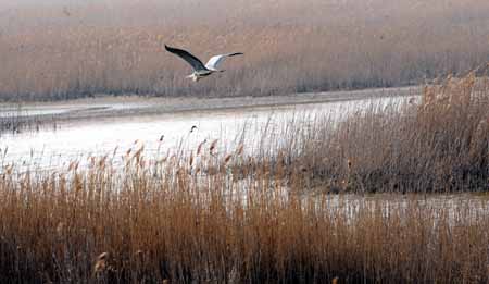 鳥(niǎo)兒在黃河三角洲濕地上飛翔。新華社記者:范長(zhǎng)國(guó)/攝 |