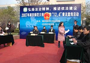 | 12月4日,第七個(gè)法制宣傳日,南京師范大學(xué)法學(xué)院學(xué)生在南京鼓樓廣場(chǎng)舉辦普法活動(dòng),現(xiàn)場(chǎng)咨詢(xún)、有獎(jiǎng)問(wèn)答、模擬法庭,吸引了市民廣泛參與。新華社記者 凌軍輝