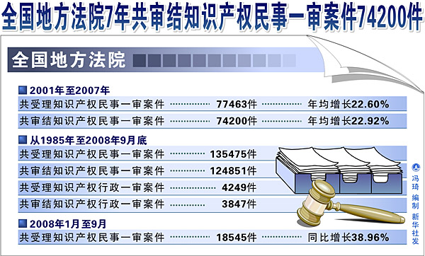 全國地方法院7年共審結知識產權民事一審案件74200件