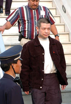 2004年4月16日,犯罪嫌疑人、原中國銀行廣東省開平支行行長余振東被美國警方押送回北京首都國際機場時走下飛機。新華社記者 袁滿